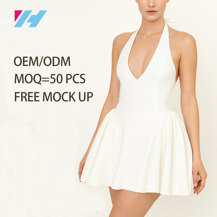 Özel üretici seksi lüks moda bayanlar Halter imparatorluk bel Backless yaz beyaz parti kadın Mini elbise